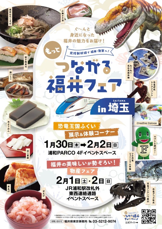 2024年3月に北陸新幹線の福井・敦賀開業により、埼玉から福井までのアクセスが大幅に向上しました。「つながる福井フェア」は北陸新幹線沿線と北関東地域の皆さまへ福井県の魅力をお届けするイベントです。福井県のシンボル「恐竜」に関する展示&体験コーナーや福井が誇るモノづくりの魅力を体感できるワークショップを開催いたします。大人も子どもも楽しめるアクティビティをご用意しております。