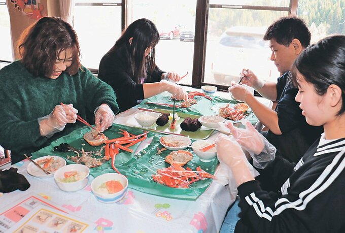 27人が訪れた昼の部では、金沢港で水揚げされた全長40~45センチのカニ140匹を用意。参加者は90分の制限時間内で、ゆでたてのカニをおいしそうに味わっていた。夜の部も行われた。2月9、11日、3月20日にも行う。料金は大人6000円、子ども(小学6年生以下)3500円。
