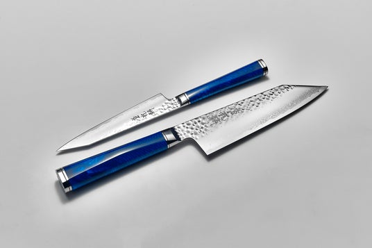 株式会社龍泉刃物の商品「蒼龍鱗(SOURYURIN)」は、切刃の鋼材に「VG10W」を使用。高級刃物鋼VG10にタングステン(W)を加えることで、耐久性・切れ味が向上。凹凸の鎚目が美しいブレードは、刃と食材の切り離れをよくする効果があります。鱗模様が浮かび上がるハンドル材質は、ポリウレタンをベースとした特殊な配合の樹脂ハンドルで耐水性に優れており、手に馴染む滑らかな握り心地です。牛刀(210mm)とペティ(135mm)の各20本数量限定での販売です。
