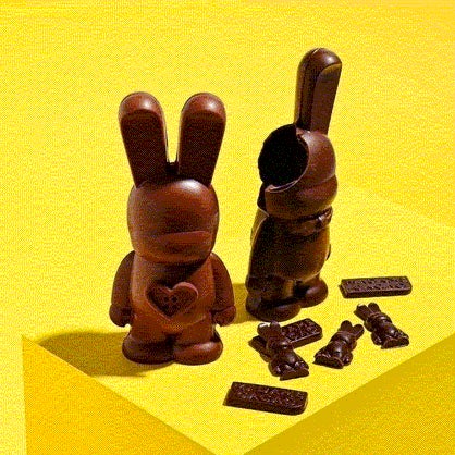 フランス年間最優秀パティシエに選ばれたクリステル・ブリュアの店。フランスの大統領府エリゼ宮で3年間、製菓の最高責任者を務める。ウサギ型チョコレートの中に、小さなモチーフとロゴが施された繊細なフリチュールが。