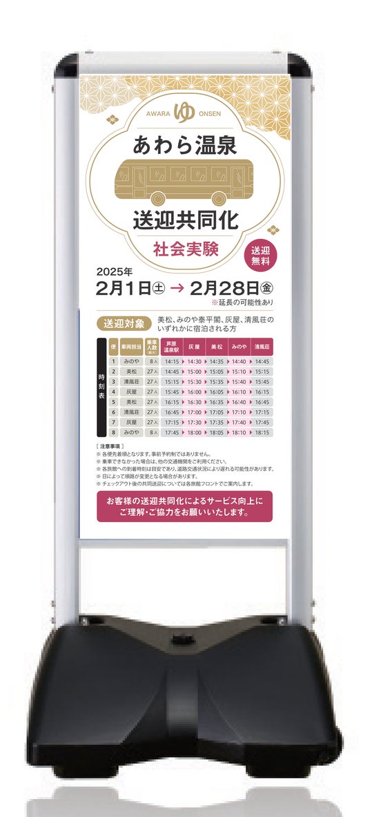 あわら市観光まちづくりビジョンのアクションプランの一環として、芦原温泉旅館協同組合に加盟する4つの旅館が、環境に配慮した温泉地づくりと業務効率化を目的に、共同送迎バスの実証実験を開始します。
