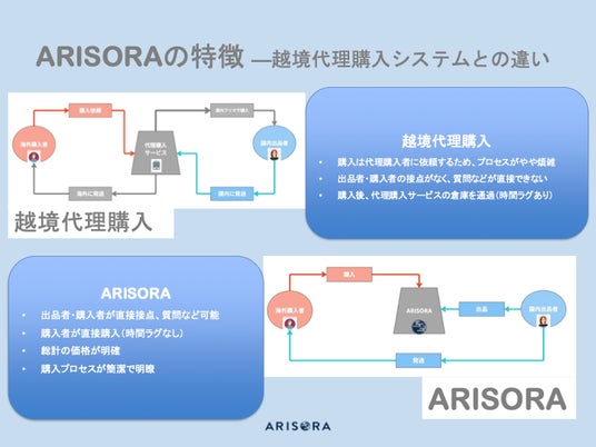 また、海外購入者に目を向けると、これまでも各社が提供している越境代理購入のシステムを用いて、海外の購入者は日本の大手フリマプラットフォームから日本の出品者の商品を購入することは可能でした。しかし、代理購入がゆえに中間マージンおよび購入者と出品者が直接やり取りできないといった事情もあり、購入者への負担が大きいものでした。ARISORAはこうした障壁の一切を取り払います。
