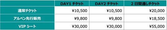 ・通常料金:ブロック指定 10,500円/2日間通し券 20,000円(いずれもゴンドラリフト往復乗車、5線サウスリフト乗車込、入場時別途ドリンク代600円必要)