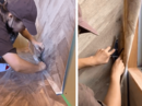 ⑤パテが乾いたら紙やすりをかけて凹凸をなくし、クロスを貼っていきます。