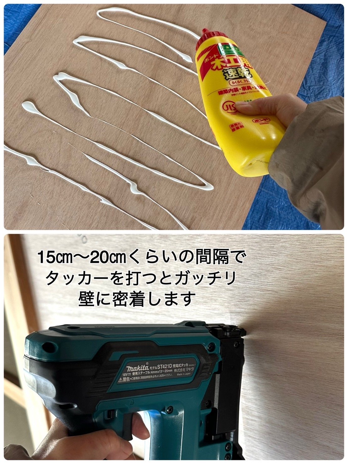 ③カットしたベニヤ板の裏面にボンドを付け、壁に貼りタッカーで打ちます。