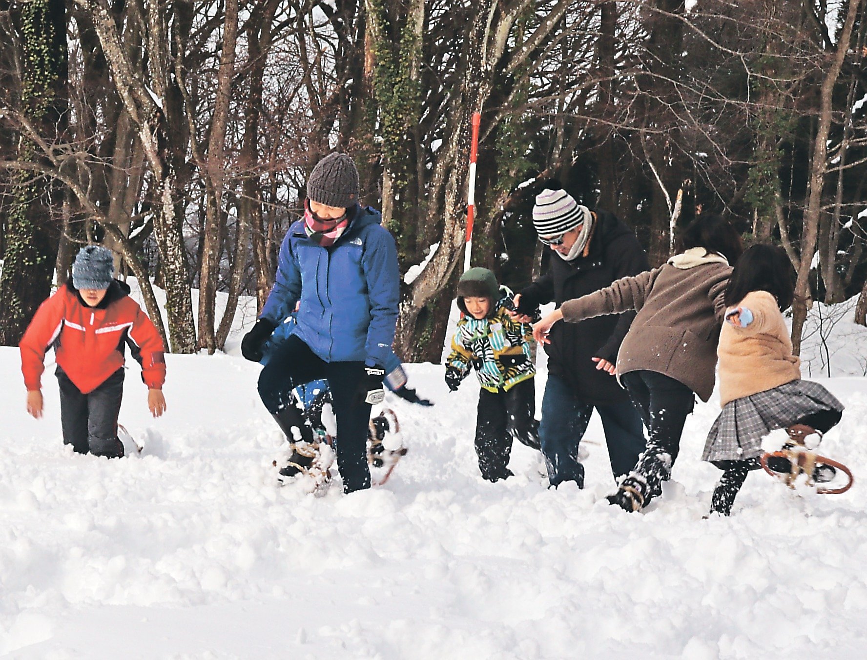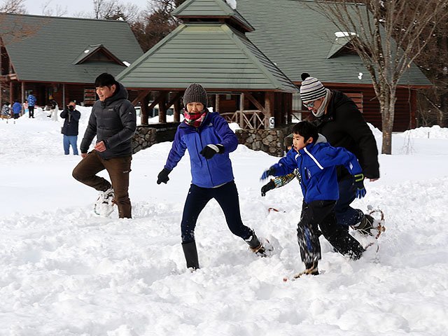 かんじきで走るレースには、大人と子どものペア10組20人が参加。かんじきを履くところからスタートし、息を切らしながら往復約80メートルのコースを駆け抜けた。父親とペアを組み、きょうだいともに参加した今井菜々さん(神通碧小4年)と貫太さん(同2年)は「転びそうになって難しかったけど楽しかった。足がパンパンになった」と笑顔を見せた。