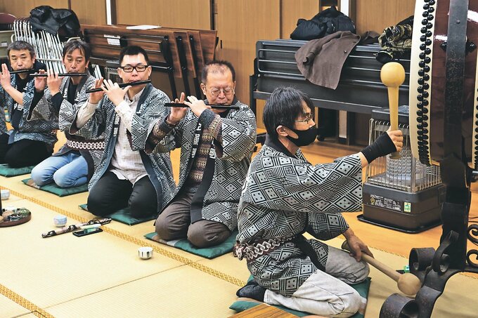 上新町では2日、上新町曳山保存会(栃山仁一会長)や自治会、囃子方の約25人が、力強い太鼓に合わせ三味線や笛を演奏し、唄(うた)を重ねた。同町の寒稽古は8日まで続く。