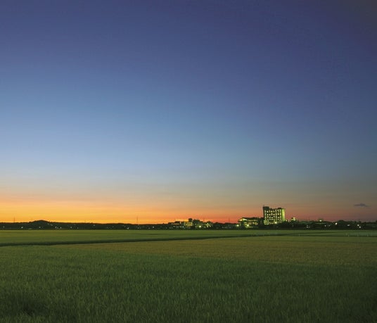 温泉街周辺は田園風景に囲まれ、田んぼが広がるのんびりとした景色が特徴です