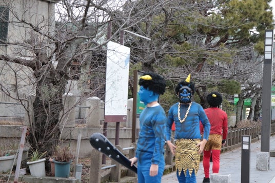 途中、舟津温泉薬師堂を訪れて豆をいただき、街の無病息災と一人一人の健康祈願を願いました。が、そこに待ち受けていたのは3体の鬼!参加者を脅かし、鬼の怖さを見せつけました。