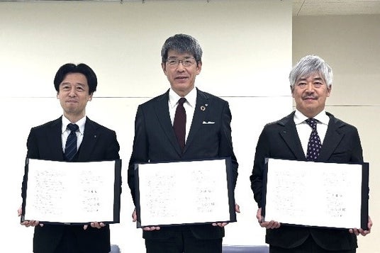 写真向かって左よりセイノーラストワンマイル 代表取締役社長 河合秀治、アルピコホールディングス 代表取締役社長 佐藤 裕一、エアロネクスト代表取締役CEO/NEXT DELIVERY 代表取締役 田路圭輔