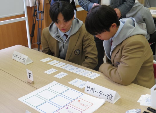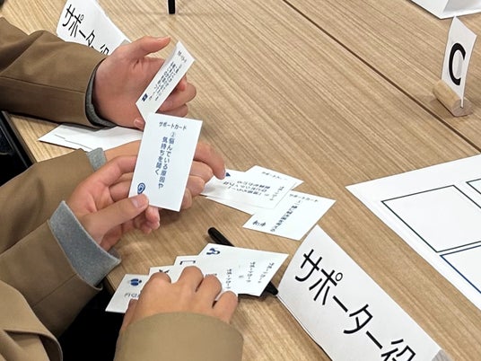 ゲームは、悩み役とサポーター役、観察役の3役に分かれて実施。悩みが書かれた「お悩みカード」と、その悩みによって自分がどのような状況になっているかを示す「状態カード」を悩み役が引いてサポーター役に提示します。サポーター役は、悩みの内容や相手の性格などを考慮しながら、適切なサポートについて相談し、「サポートカード」から3つのサポートを選択。悩み役とサポーター役それぞれが選んだ「サポートカード」を照らし合わせながら互いの意見を交換しました。