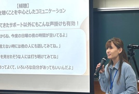 前半は、 NPO法人第3の家族 代表 奥村春香さんと、NPO法人Light Ring. 代表理事 石井綾華さんから、こどもが持つ深刻な悩みの現状と、友人を支えるためのコミュニケーション方法について講義を行いました。後半は、グループに分かれ、同NPO法人らと共同で企画したカードゲームを活用したワークを行い、深刻な悩みを持つ友人に寄り添うサポートを考え、発表を通して学びを深めました。