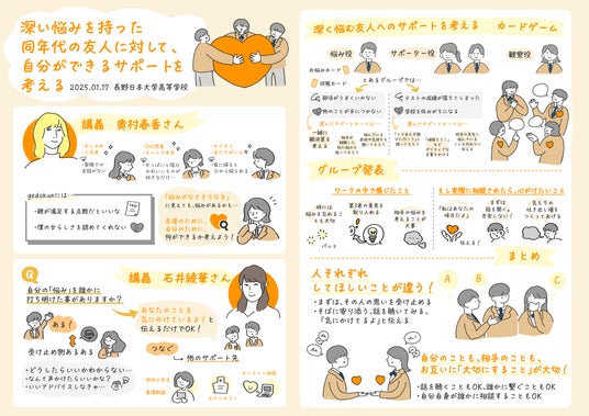 生徒らは、自分と友人との間で感情や考え方に違いがあることを体感し、深刻な悩みを持つ友人の気持ちを想像することの難しさや、話を聴くこと・寄り添うことの重要性について理解を深めました。