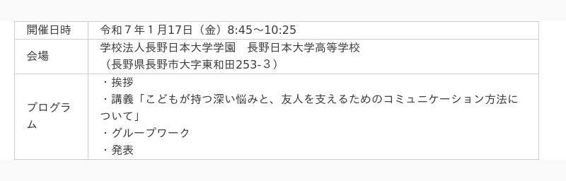 長野県は、”子どもの自殺ゼロ”を掲げ、『子どもの自殺危機対応チーム』の取組が全国のモデルケースとされるなど、積極的な取組を行っていることから、本ワークショップと講演会の開催地として選ばれました。