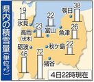 同気象台によると、5日は昼前にかけて警報級の大雪となる恐れがある。山間部では5日夜遅くから6日にかけても強く降る可能性があり、交通障害などへの警戒を呼びかけている。5日午後6時までの24時間降雪量は、県内の多い所で平野部50~60センチ、山間部80センチと予想している。