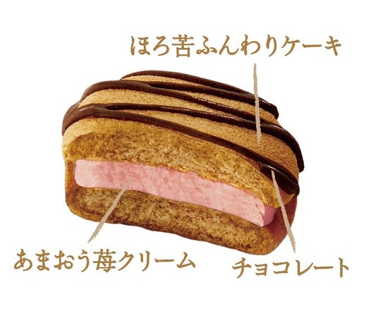 ◆クリームには福岡県産あまおう苺の果汁を使用し、ソフトクリームパウダーやカラメルパウダーを練り込んだ生地でサンドしました。