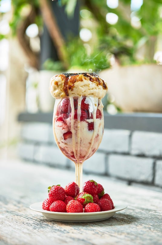 地元で生産されるいちごを贅沢に使用した、苺の旬の時期にしか味わえない人気メニュー。苺増しメニューには約2パック分の苺が使用されており、目の前でブリュレされるところも見どころ。