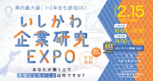 県内企業への就職を検討する学生向けに、2025年2月15日(土)にオンラインイベント「いしかわ企業研究EXPO」を開催いたします。