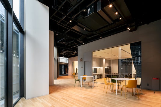 1階楽屋中前ロビー。斜めの軸に雁行配置した諸室により生まれた共用空間に,テーブルと椅子を配置し多様な居場所をつくっている