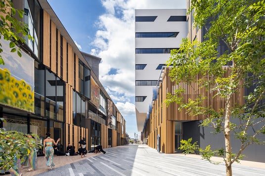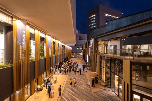 キャニオンストリート外観夜景。壁面(木調パネル,バナー)と開口部をリズミカルに配置したデザインにより,賑わいと文化活動・情報を発信する