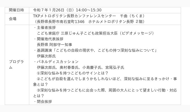 こども家庭庁は、こどもが自ら命を絶つようなことのない社会の実現に向けて、保護者等の大人を対象としたこどもの自殺対策に関する講演会を、1月26日に長野県長野市で開催しました。この講演会は、「こどもの自殺対策の推進に向けたデジタル広報啓発事業」の一環として、こども家庭庁主催で初めて開催しました。