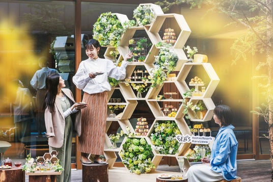 3年目の今年は、はちみつとチーズをテーマに、特大はちみつアフタヌーンティーがパブリックスペース「TAMARIBA(タマリバ)」に登場します。蜂の巣に見立てた大小さまざまなハニカム型の木枠を組み合わせたアフタヌーンティーは、蜂が蜜を採取しているかのように、春らしい花々も彩られています。他にはない見上げるほどの高さがある一風変わったユニークなアフタヌーンティーを、BEB5軽井沢オリジナルで作成しました。時には背伸びをしたり、丸太の台に乗ったりして、スイーツを取る瞬間も仲間とわいわい楽しめます。