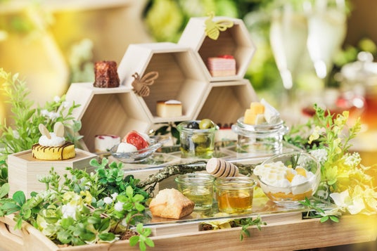 特大はちみつアフタヌーンティーから好きなスイーツを選んで、自分で盛り付けを楽しめる「ミニはちみつアフタヌーンティーセット」を用意します。今回は蜂の巣をモチーフに、スイーツやセイボリーを盛りつけると、まるでお花畑を蜂が飛んでいるかのように見えるデザインに仕上げました。自分の好きなものだけを盛り付けるもよし!全種類を盛り付けるもよし!自分好みのミニはちみつアフタヌーンティーセットを作ることができます。