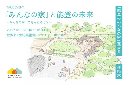 東日本大震災の被災地で、家や仕事を失った人々が、再び立ち上がり生活を回復するための拠点として建てられた施設「みんなの家」。現在、2024年に発生した能登半島地震の被災地においても、6棟の「みんなの家」が計画されています。能登半島での「みんなの家」の計画をきっかけに、能登の未来をともに考えるため、能登の「みんなの家」の運営者と、NPO法人HOME-FOR-ALLの建築家メンバー、金沢21世紀美術館館長が登壇者となりトークイベントを開催します。