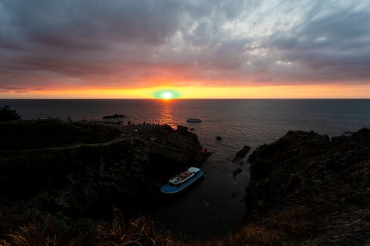 日の出や日没時に、太陽の上端が緑⾊に見える現象。緑光。緑閃光とも言われる。(広辞苑参照)