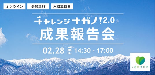 官民共創を支援する株式会社Publink(代表取締役社長:栫井 誠一郎)と、長野県庁(長野県知事:阿部守一)が運営するオープンイノベーションプログラム「チャレンジナガノ2.0」における、68者・167の提案のうち、”重点推進枠(※1)”に採択されたプロジェクトおよび”パートナー枠(※2)”の市町村が行うプロジェクトの「成果報告会」の視聴者募集を開始いたします。