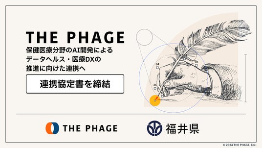 株式会社ザ・ファージ(以下 THE PHAGE)は、福井県との保健医療分野のAI開発によるデータヘルス、医療DX推進とデータ取得プロジェクトへの参画を通じた研究の推進に向けた連携に関する連携協定書を締結しました。