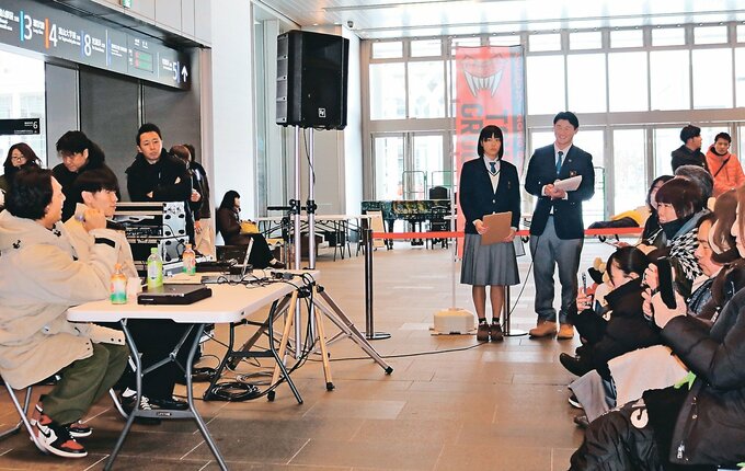 スポーツマネジメントを学ぶ富山商業高校の3年生約40人が9日、富山駅南北自由通路で、バスケットボール男子Bリーグ2部の富山グラウジーズなどと協力したイベント「富山エキナカFestival」を開き、来場者が試合のパブリックビューイング(PV)やシュートゲームなど多彩な催しを楽しんだ。