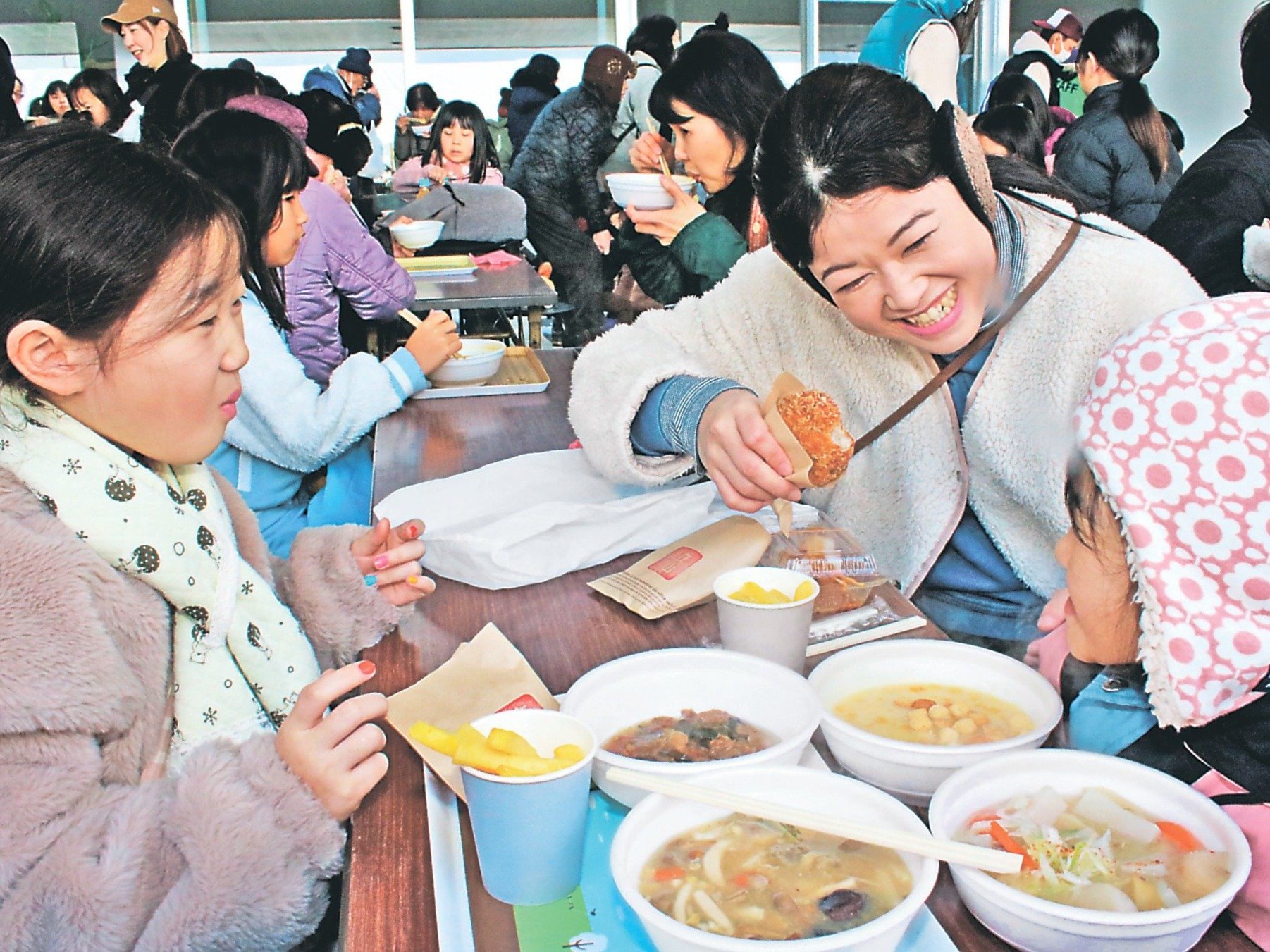「たてやま鍋まつり」が11日、富山県の立山町防災児童館複合施設「アカリエ」で開かれ、多くの家族連れらが熱々を味わった。
