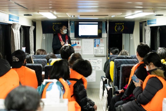 定置網に到着するまで、船内では係員がホタルイカについて解説を行っています。