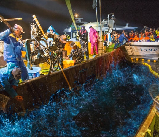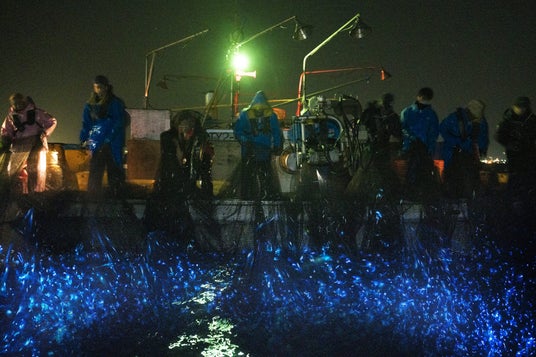 漁師さんの全面協力の下、照明を消してもらいホタルイカの光が広がる神秘的な光景をお楽しみいただきます。