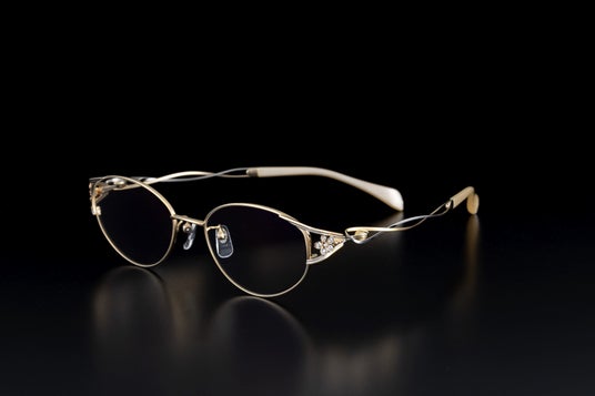 枝の先から咲き始めたばかりの桜の花をイメージして作られたモデルです。二股に分かれたヨロイに桜の花が咲くデザインは存在感たっぷり。フレームのサイズ感はやや大ぶりではあるものの、線が細いため、華やかさがありつつもすっきりとかけていただけます。