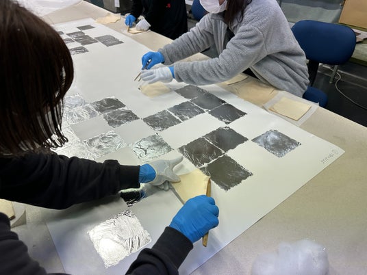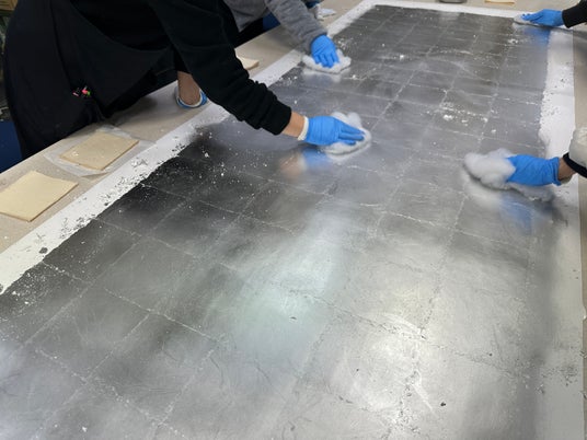 現地の職人が施工できる特別な箔シート材今回の施工は、建材用シートに金沢箔をあしらったものを、海外へ輸出する形で実現しました。金沢の工房で職人が箔をあしらい、米国では、当地の職人が施工をします。こうした手法によって、世界各国で建材としての箔加飾が可能となっています。