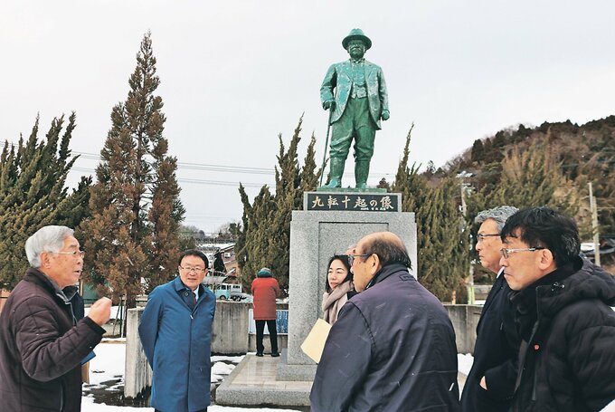 一行は同市薮田にある浅野の銅像を見学した。同顕彰会理事の寺島順一渋川商議所会頭は「氷見と交流が深まった。他の地域とも交流を深めたい」と話した。