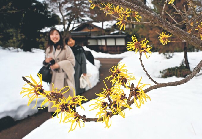 富山市の富山城址公園では同日、マンサクの花が咲き、訪れた人の目を楽しませた。山野でいち早く「まず咲く」ことが名前の由来とされる。愛知県から観光で訪れた会社員、斉場実希さん(34)は雪に映える黄色い花を見て「白い雪とのコントラストがきれいですね」とほほ笑んだ。