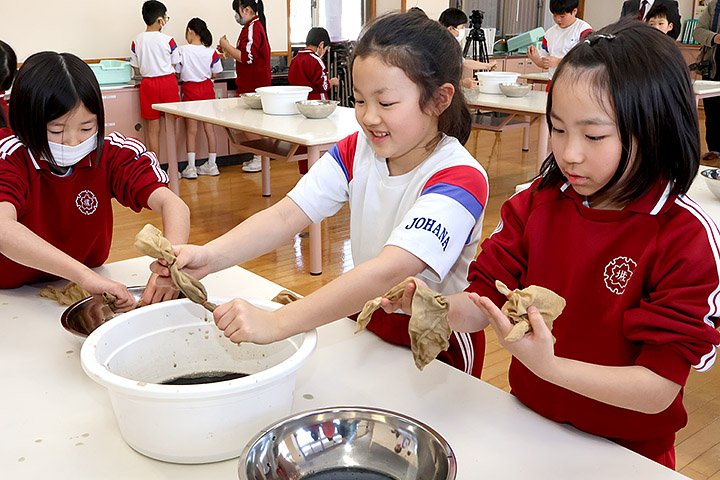 3年生は昨年春から、総合的な学習で絶滅が危ぶまれているギフチョウを卵からさなぎになるまで育てたり、地元に放したりしている。染色体験も学習の一環で、染織作家の藤井栄孝さん(同市井口)が手ほどきした。
