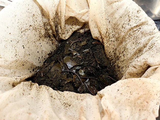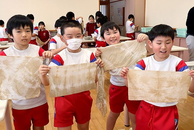 富山県南砺市城端小学校の3年生38人は14日、同校で、自分たちが育てたギフチョウの幼虫のふんを使って、絹の布を染めた。煮出した染料で、さまざまな模様に仕上げた。