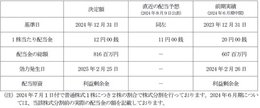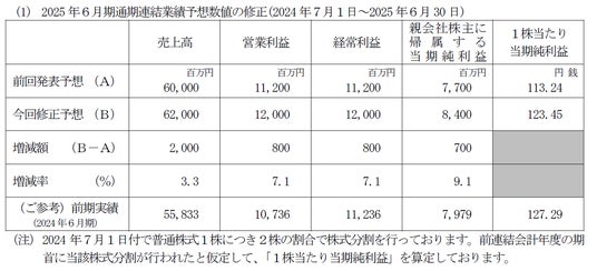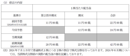 今回の通期業績予想数値の修正と今後の事業環境の見通しを総合的に勘案し、中間配当を前回予想から1円増配の1株当たり12円とし、また、期末配当予想についても1円増配の1株当たり12円に修正いたします。