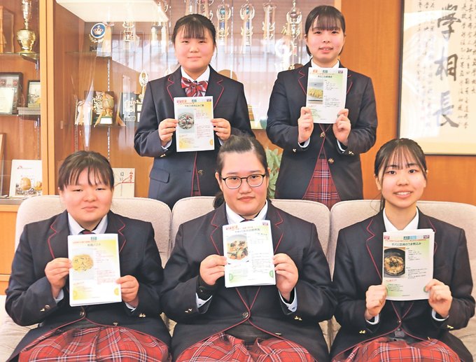 富山県の高岡龍谷高校の調理科の生徒6人が考案した料理が、北陸農政局がまとめた冊子「災害時にも役立つ和ごはんレシピ」に掲載された。14日に同校で冊子の贈呈があった。