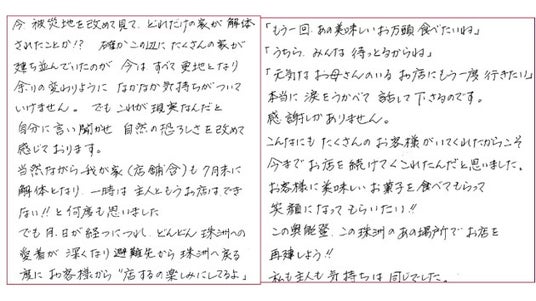 お客様、地域の皆様、取引先の皆様、珠洲市商工会議所、石川県の支援機関など多くの方々よりいただいた温かいご支援に心から感謝し、多間栄開堂の再建に尽力します。