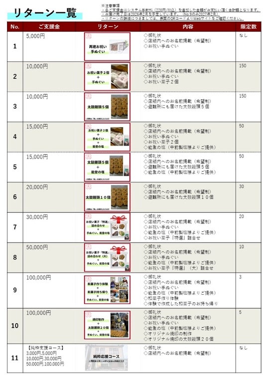 支援者全ての方に御礼状、店舗内へのお名前掲示(希望制)がつきます。※詳細は下記を参照。