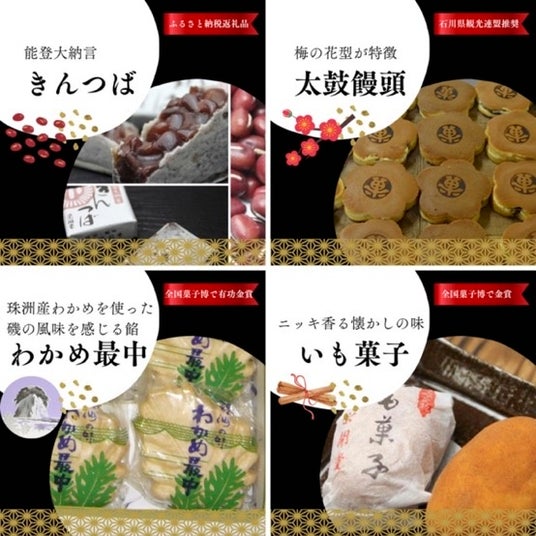 特に人気があった和菓子は、能登大納言小豆をたっぷり使った「能登大納言きんつば」、どら焼きとはひと味違う珠洲伝統のお祝い菓子「太鼓饅頭」、珠洲産のワカメを粉末にして餡に混ぜ込んだ「わかめ最中」、ニッキの香りが懐かしいお芋の形をした「いも菓子」です。