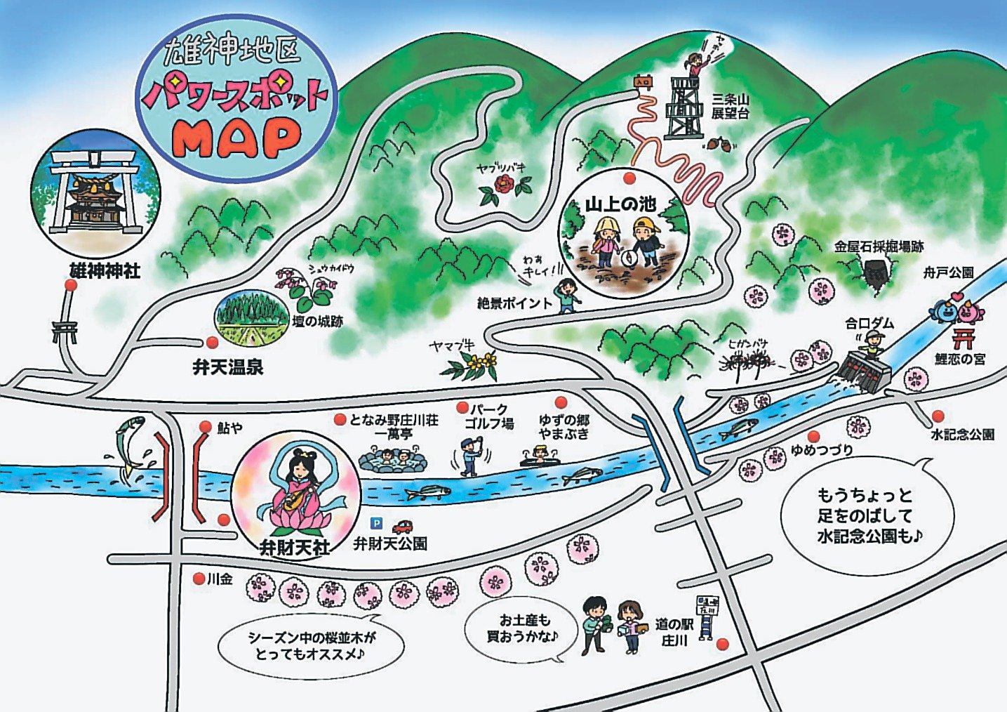 マップは現地を散策した上で感じた見どころを紹介。磁場が存在しない「ゼロ磁場」のパワースポットとされる「山上(さんじょう)の池」や、三条山の遊歩道で見られる花などを盛り込んだ。地区内にある入浴施設「ゆずの郷やまぶき」の職員で、絵が得意な近川恭子さんが学生のアイデアを基にデザインした。