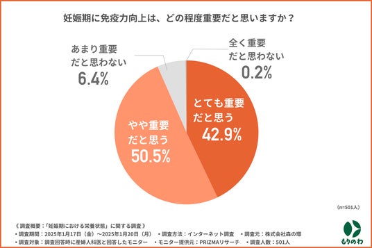 「妊娠期に免疫力向上は、どの程度重要だと思いますか?」と質問したところ、9割以上の方が『とても重要だと思う(42.9%)』または『やや重要だと思う(50.5%)』と回答しました。