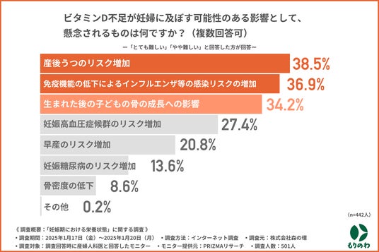 「ビタミンD不足が妊婦に及ぼす可能性のある影響として、懸念されるものは何ですか?(複数回答可)」と質問したところ、『産後うつのリスク増加(38.5%)』と回答した方が最も多く、『免疫機能の低下によるインフルエンザ等の感染リスクの増加(36.9%)』『生まれた後の子どもの骨の成長への影響(34.2%)』と続きました。