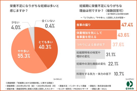 約半数が妊娠期のホルモンバランスの変化や体調不良による食事の偏りが栄養不足の理由として考えられているようです。また、体重管理の意識の高まりや、つわりによる食欲低下も大きな要因となっており、妊娠期の栄養管理の難しさが浮き彫りとなりました。